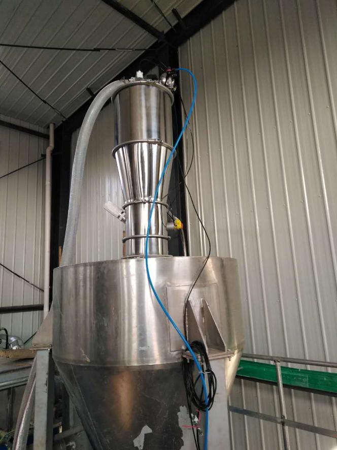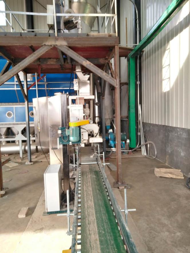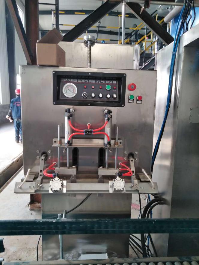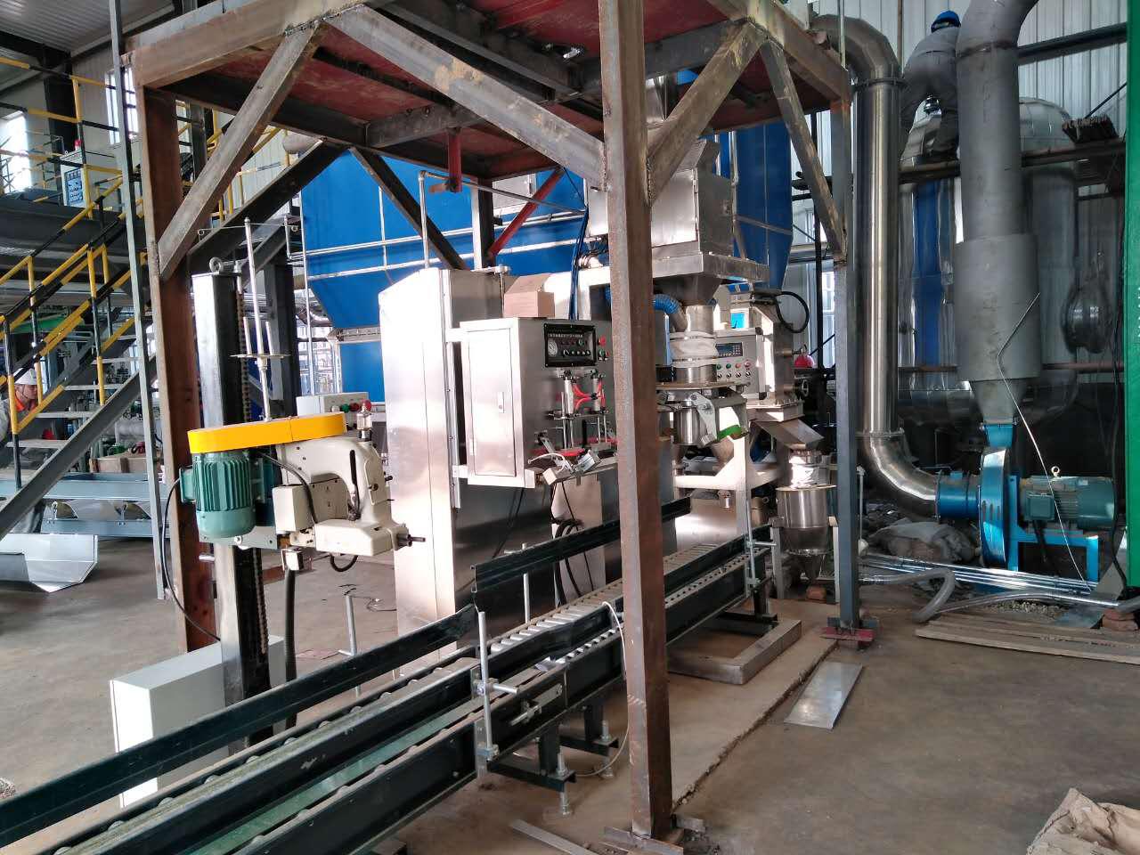 集料分配裝置接收干燥機(jī)組的出料,經(jīng)加速室由負(fù)壓氣力輸送系統(tǒng)輸送至緩存料倉,再通過分料器為包裝機(jī)供料,包裝機(jī)采用特殊夾袋機(jī)構(gòu),配合除塵系統(tǒng)避免揚(yáng)塵。抽真空熱合機(jī)和縫包機(jī)對滿袋物料進(jìn)行密封封口,配合變頻皮帶輸送機(jī)協(xié)同輸送包裝袋。此套儲運(yùn)、包裝系統(tǒng)在滿足用戶生產(chǎn)需要,提供自動化的同時,又大大改善了操作環(huán)境。受到客戶的高度贊揚(yáng)。